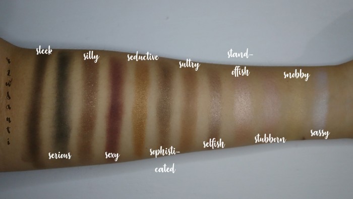 Palette ini terdiri dari 12 warna yang nuansanya emang netral semua. Kalo menurut aku sih kombinasi antara warna matte dan satin/shimmer nya lumayan pas dan bisa bikin banyak look dari yang netral sampe smokey pun bisa. Poin plusnya lagi adalah palette ini punya warna matte hitam! Sebagai penyuka berat smokey eyes aku agak ribet kalo dalam 1 palette tuh gak punya warna gelap / hitam karena artinya harus bawa warna hitam terpisah lagi dan itu tuh gak praktis. At least dengan palette ini aku bisa buat 1 look yang aku mau tanpa harus pindah – pindah palette lagi.