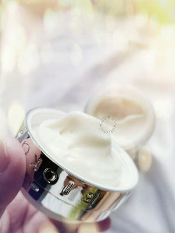 Tesktur dari day cream ini super thick, tapi nggak terlalu heavy. Ini cukup unik karena biasanya day cream teksturnya ringan, sedangkan tekstur yang agak lebih berat umumnya dipakai untuk night cream. Meskipun begitu, cream berwarna putih kekuningan ini cukup mudah diblend kok.