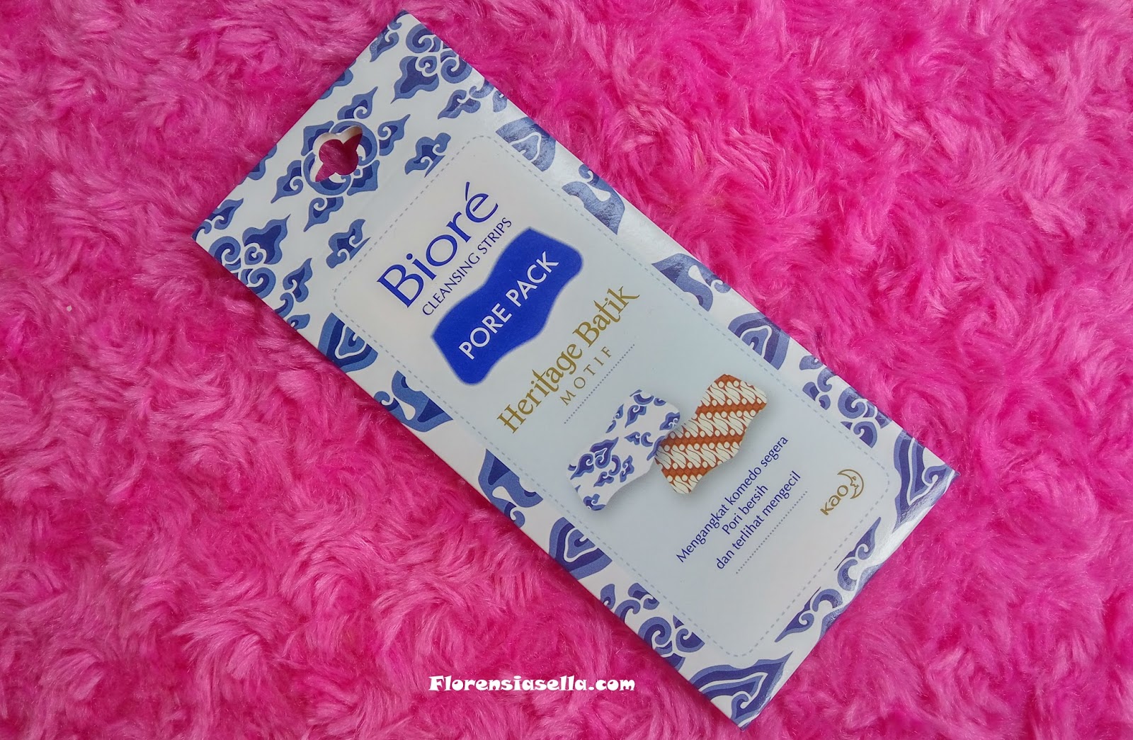 Didalamnya terdapat 4 strips Biore Pore Pack, 2 gambar batik berwarna coklat, dan 2 gambar batik berwarna biru..
