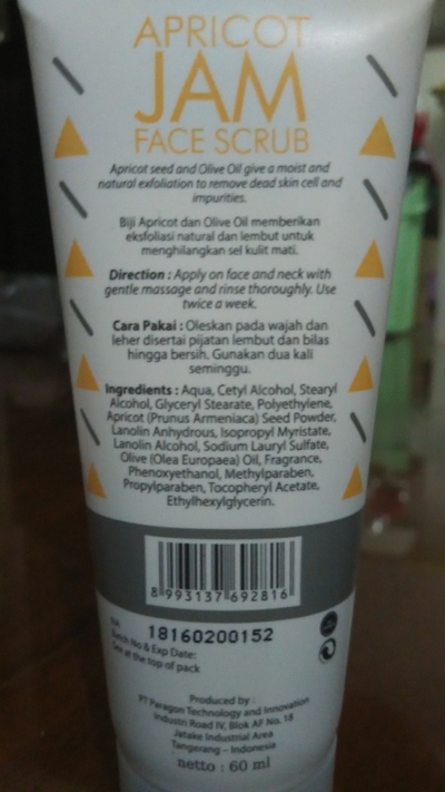Kemudian kalau dari klaimnya, dia ngga ada klaim yang menarik banget gitu sih cuma bilang kalau biji apricot dan olive oil yang terkandung didalamnya dapat mengangkat sel kulit mati kita, dan memberikan efek lembut setelah pemakaian. Jadi, setelah pengalaman aku pakai produk ini memang lumayan terangkat sel-sel kulit mati yang ada di wajahku ini dan sangat melembutkan!! Biasanya aku pakai produk ini malam sebelum tidur kemudian aku bersihkan pas mau tidur dan sampai siang hari dikeesokan harinya kulit wajah aku rasanya lembut banget dan ngga kering sama sekali, worth it untuk kalian yang punya kulit cenderung kering kaya aku. Kalo dari aroma dan teksturnya sendiri bisa ditebak lah ya “apricot jam” ya! Aromanya apricot banget seger enak gitu dan untuk teksturnya warnanya putih tidak terlalu cair dan ada biji-biji apricotnya