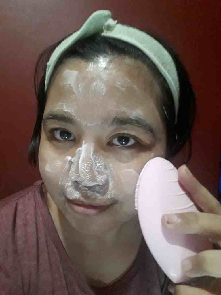 Saya biasanya menaruh sedikit sabun (disini saya pakai sabun Senka yang kemasan biru) di bagian sikat silikon lalu menyalakan Kleura Waterproof Facial Clean Machine. Karena getaran produk, busa sabunnya jadi melimpah. Lalu saya aplikasikan di bagian kening, pipi, dagu, dan hidung. Saya memberi perhatian khusus di bagian hidung, karena hidung saya memang banyak komedonya.