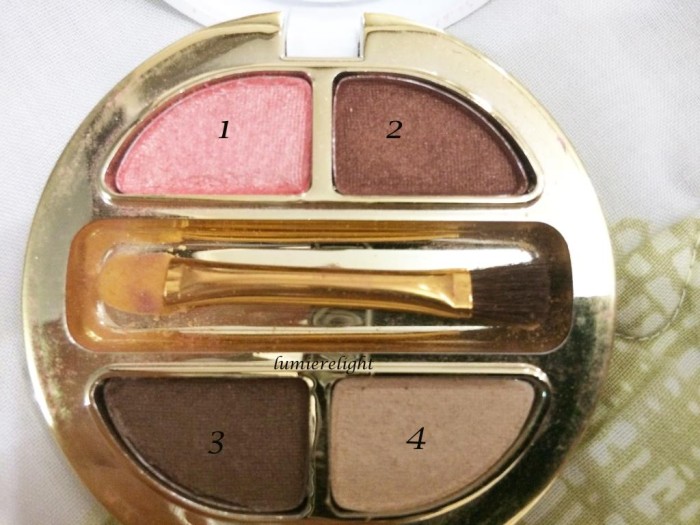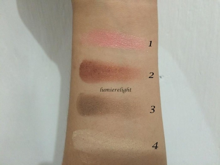 Menurut aku, eyeshadow ini semuanya ada tambahan glitternya, tapi yang paling menonjol itu yang nomor 1. Kalo yang nomor 4 lebih ke warna kuning cream gitu, yang aku kira paling banyak glitternya malah ternyata paling sedikit. Dari keempat shadow yang ada, menurut aku yang paling creamy teksturnya adalah yang nomor 2 dan 3.
