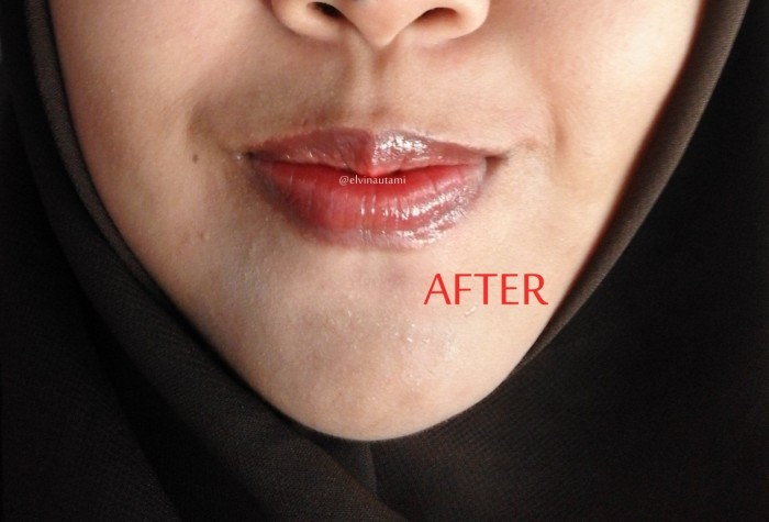 Setelah pemakaian berasa agak lengket kayak permen lolipop namun masih nyaman digunakan berjam-jam, bukan kayak abis makan gorengan sih namun bibir kita terlihat seperti berkilau gitu, jadi termasuk oke meski digunakan sehari-hari dan gak perlu diusap dengan tisu.